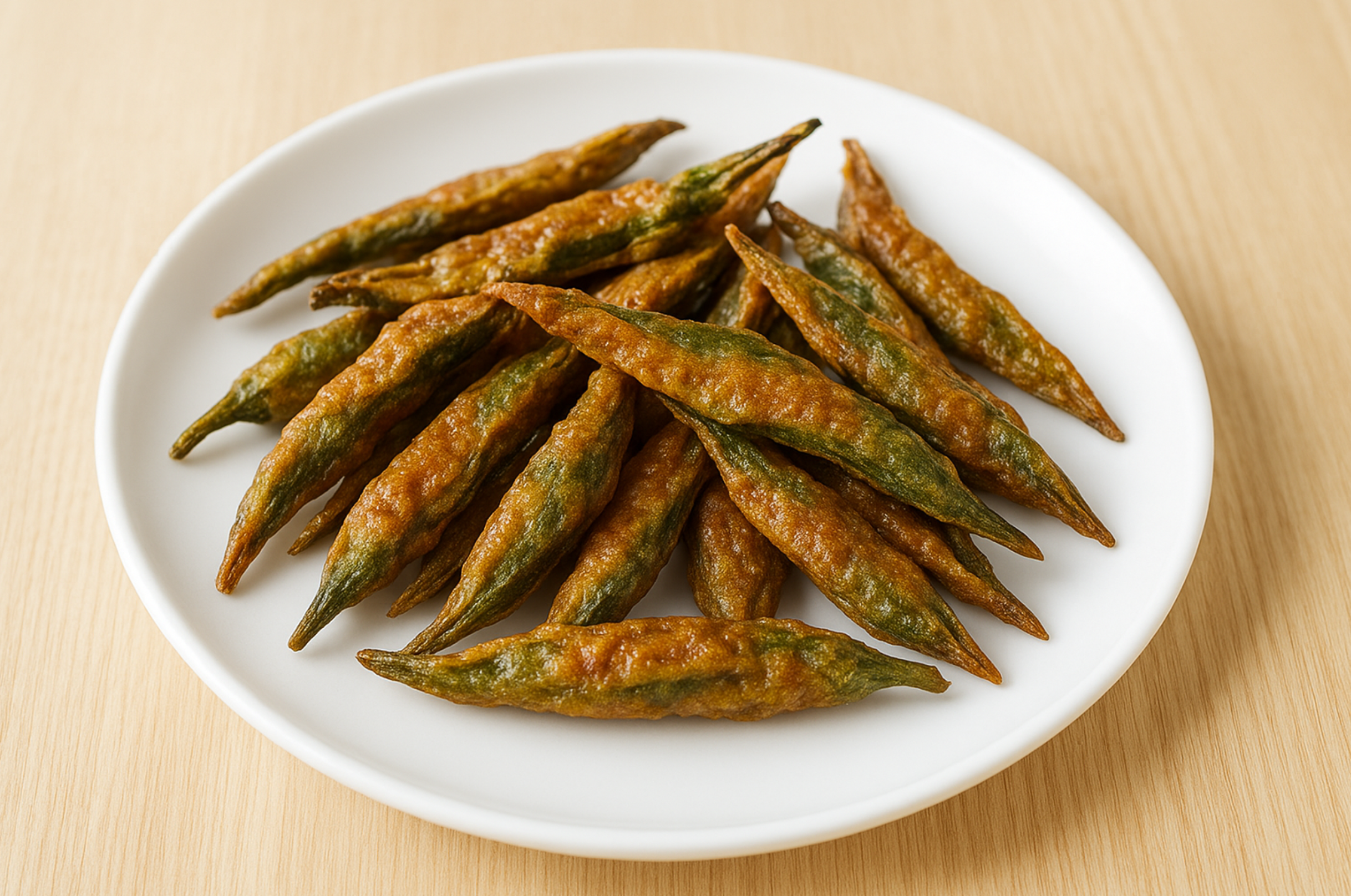 고추부각은 기본 재료만 있으면 집에서도 손쉽게 만들 수 있는 전통 간식입니다. 풋고추 안에 튀김가루나 찹쌀가루를 발라 바삭하게 말린 뒤 기름에 튀기면 끝이지요.