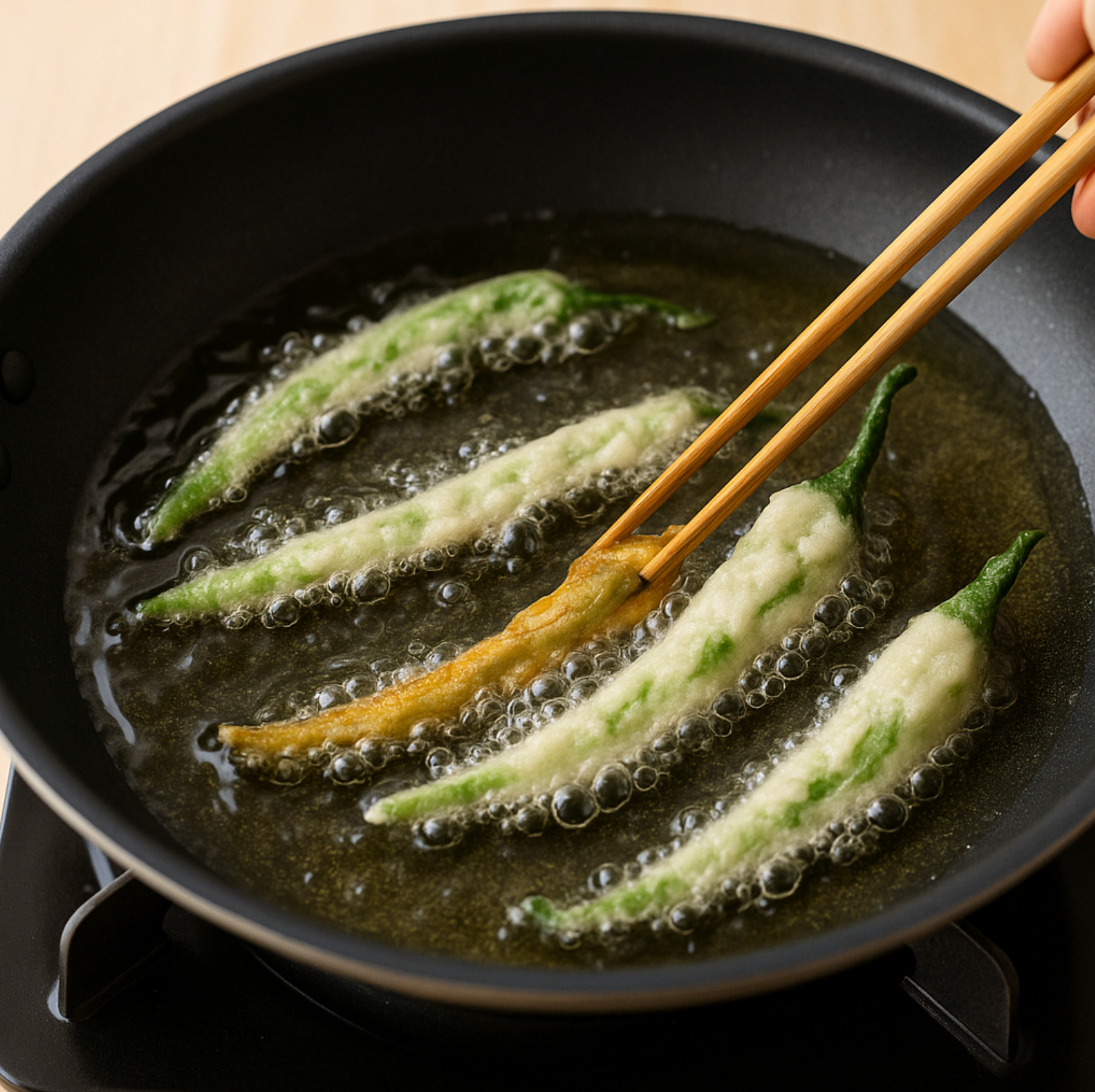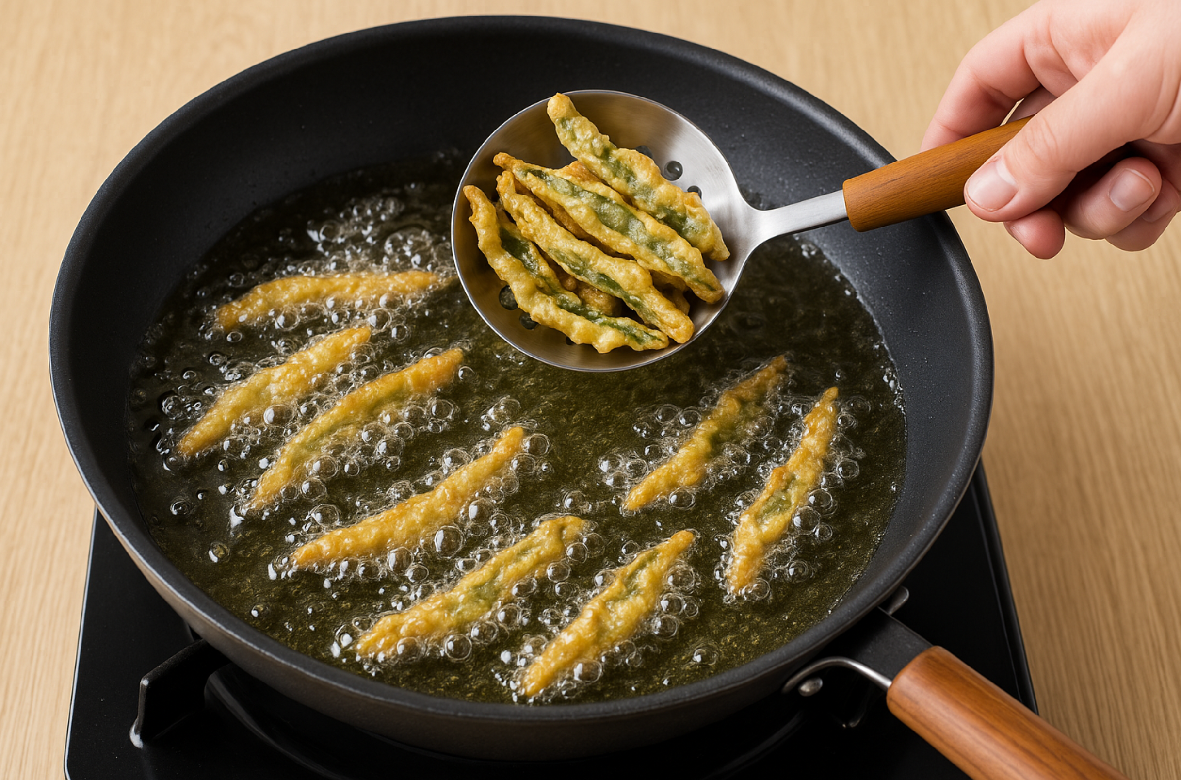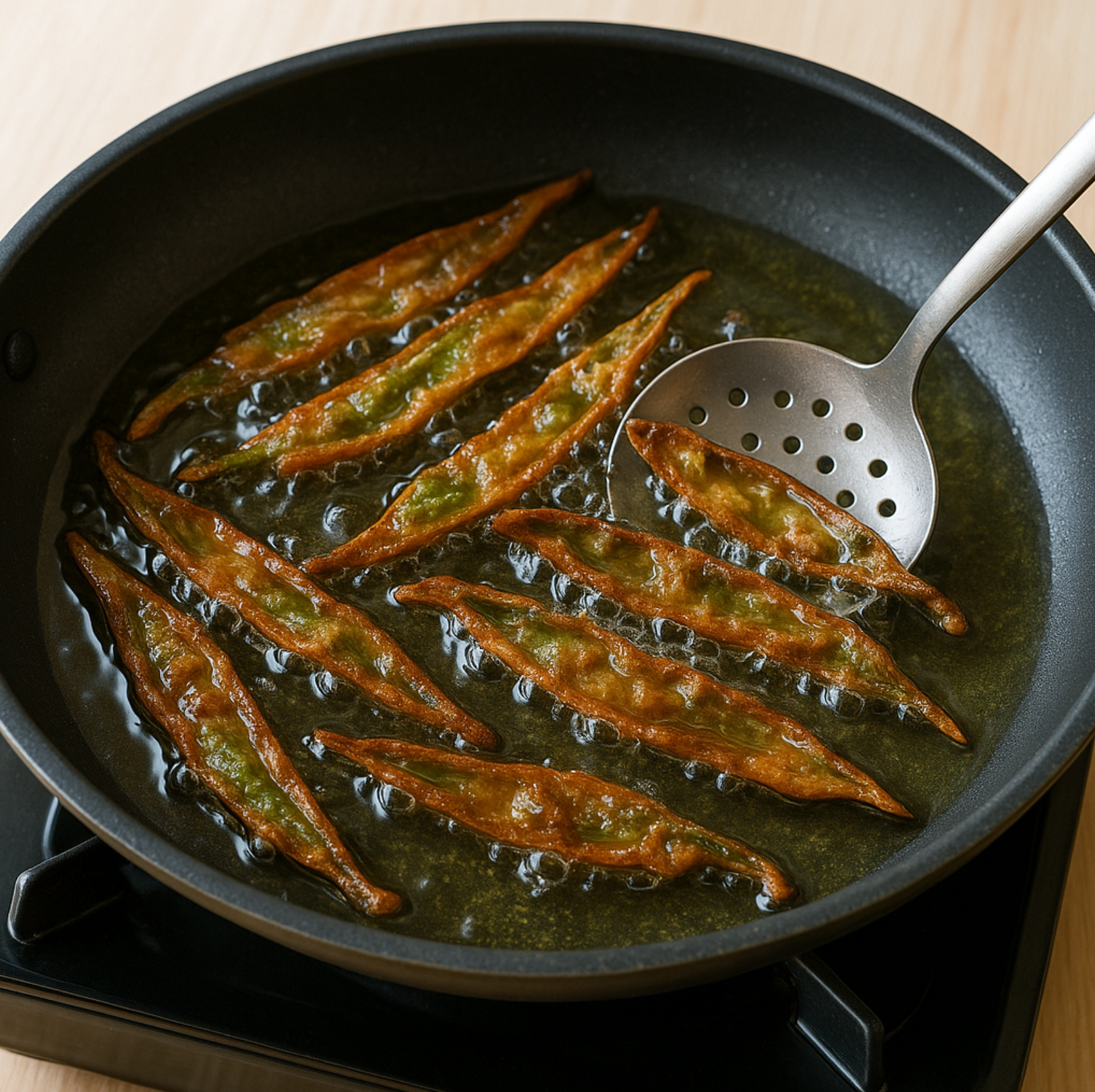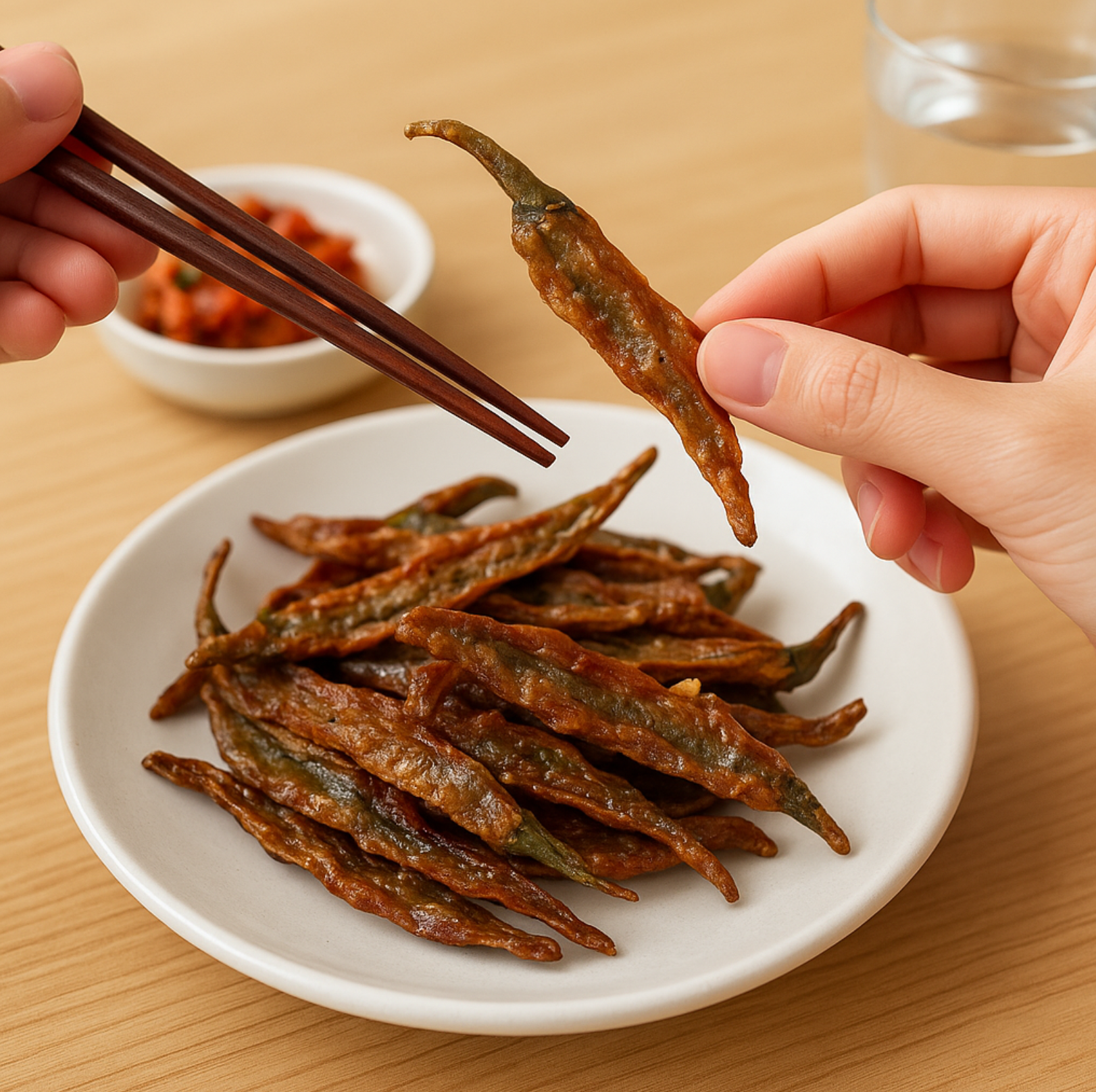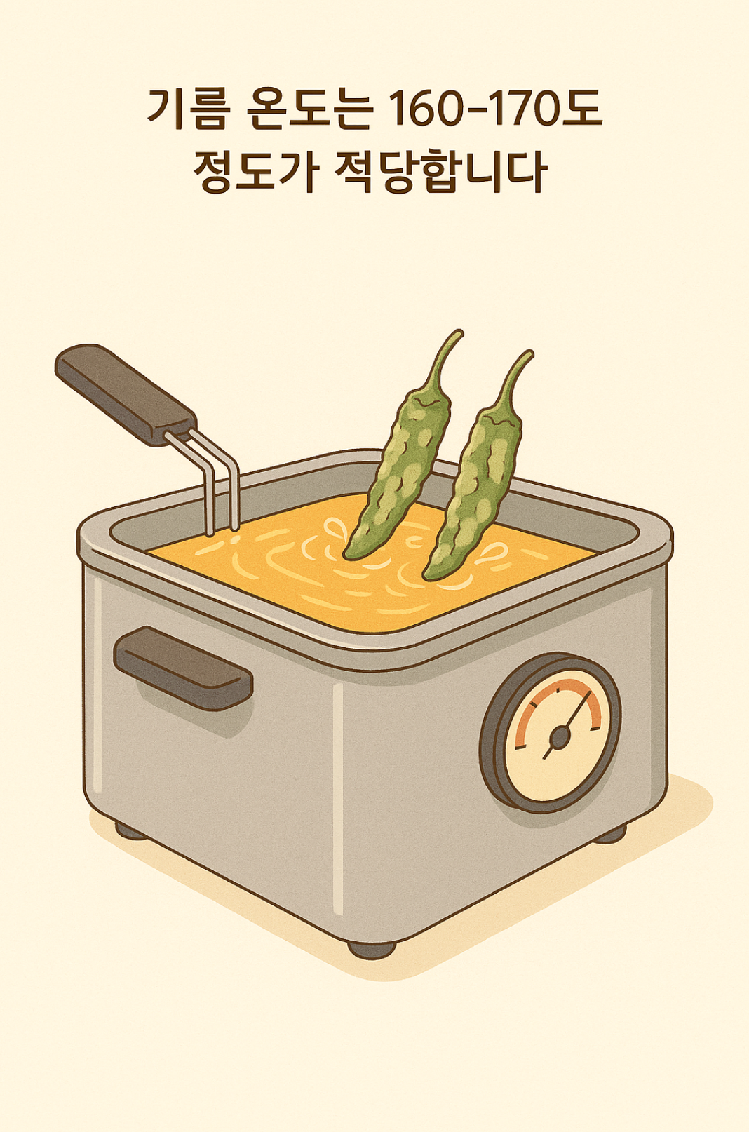고추부각은 튀김 방식이 중요합니다. 잘못 튀기면 눅눅하거나 기름이 과하게 흡수되기 때문이죠.