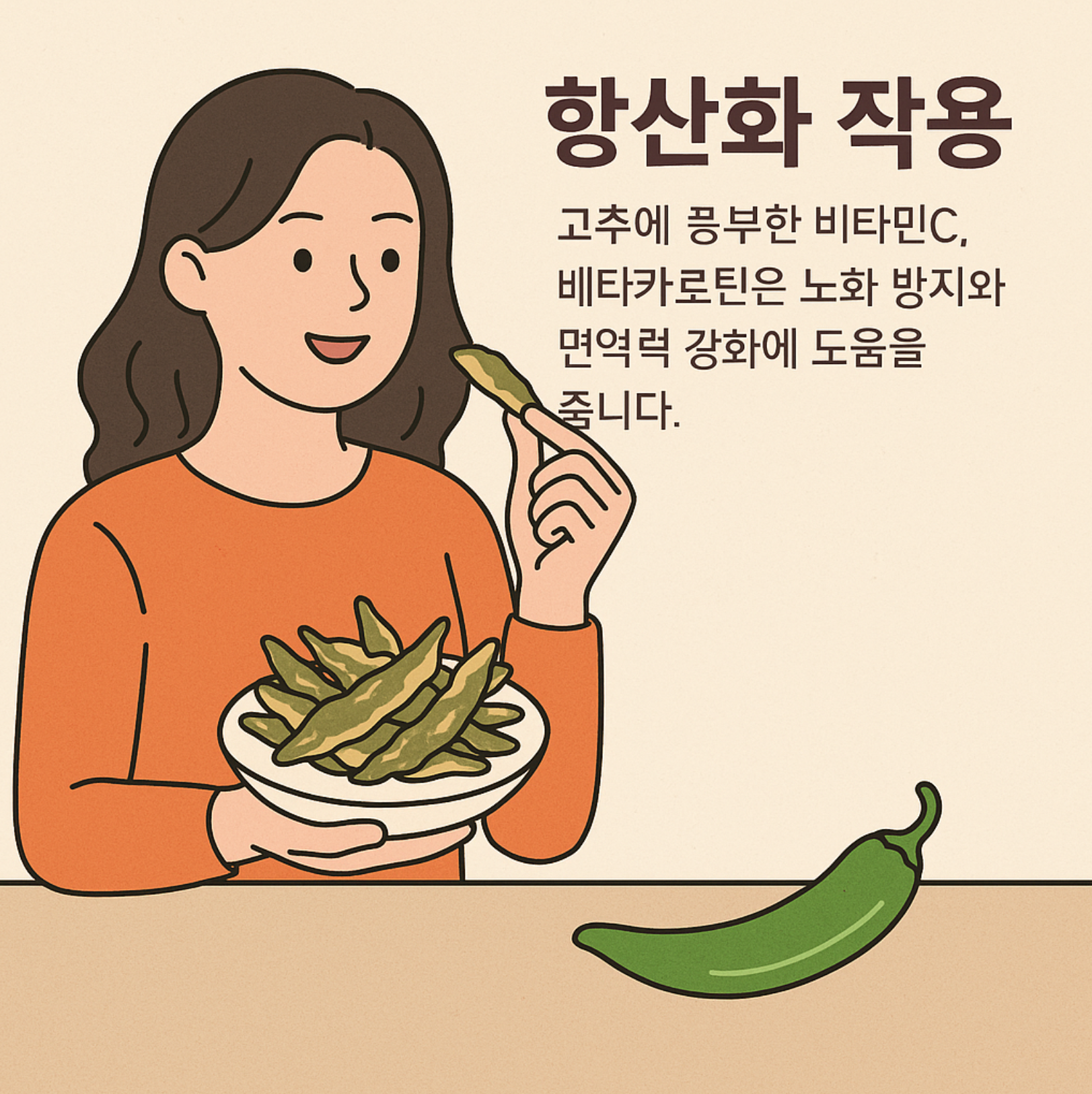 - 항산화 작용 : 고추에 풍부한 비타민C, 베타카로틴은 노화 방지와 면역력 강화에 도움을 줍니다.