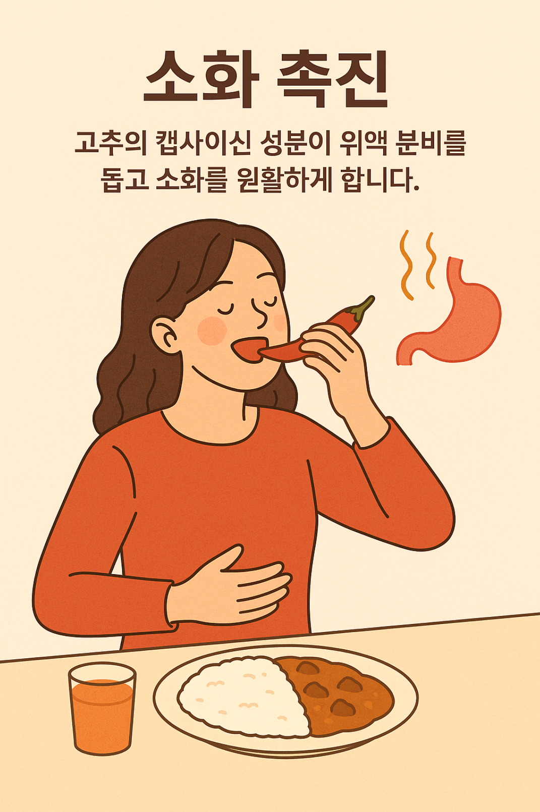 - 소화 촉진 : 고추의 캡사이신 성분이 위액 분비를 돕고 소화를 원활하게 합니다.
