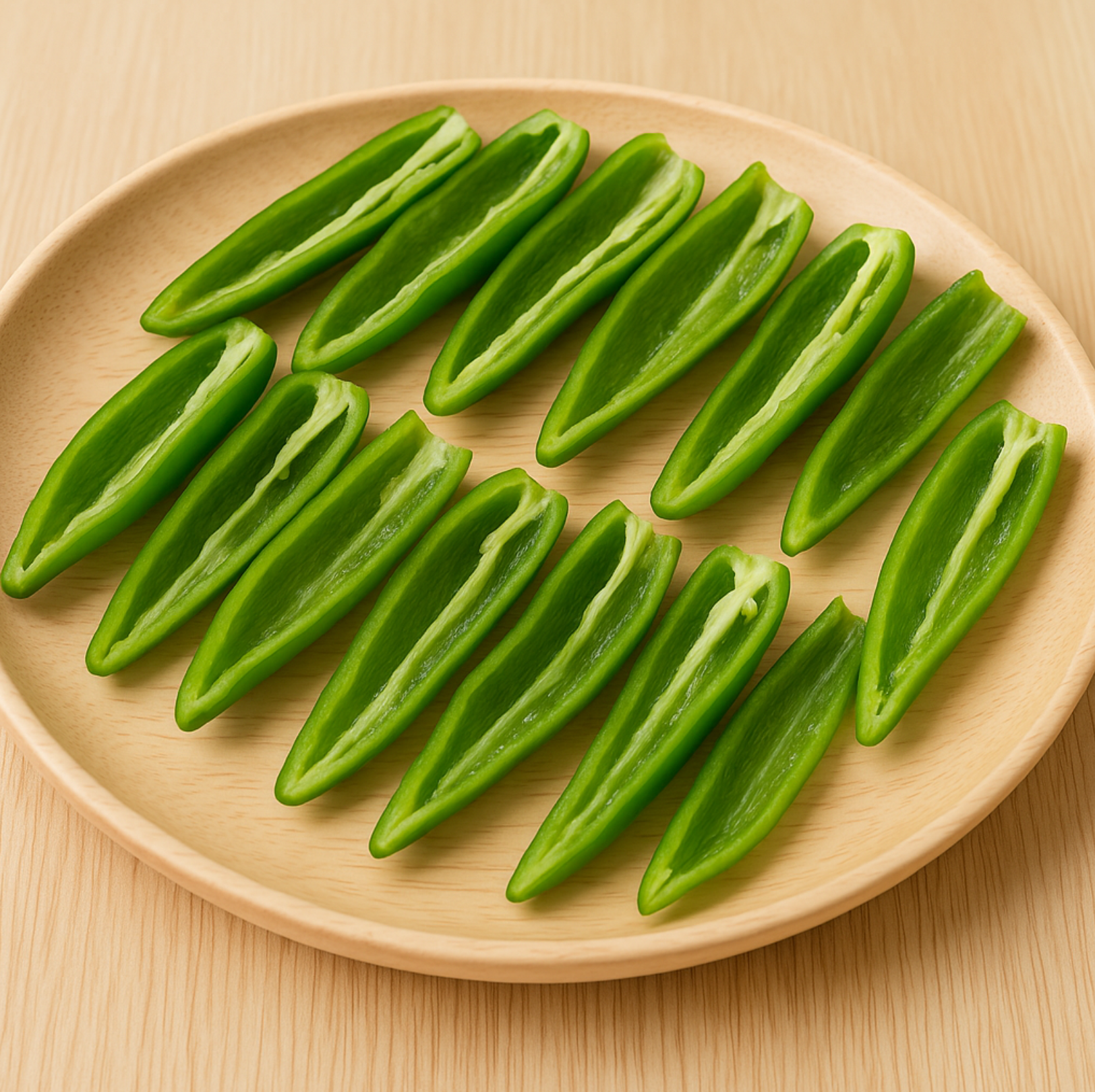 - 풋고추를 세로로 갈라 씨를 제거하고 깨끗이 씻은 후 물기를 제거합니다.