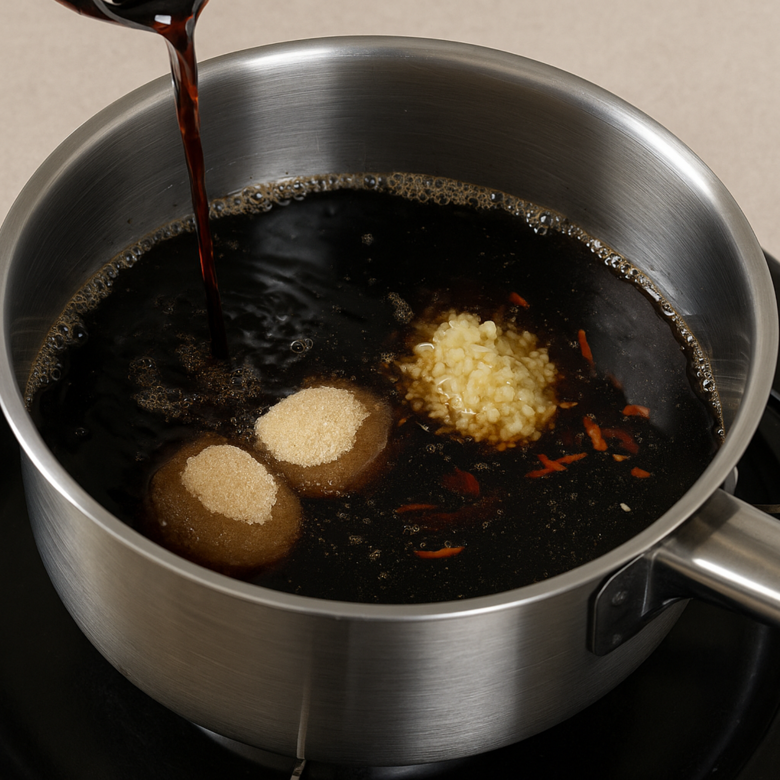 2. 양념장 끓이기: 간장, 물, 설탕, 식초, 다진 마늘을 냄비에 넣고 끓입니다.