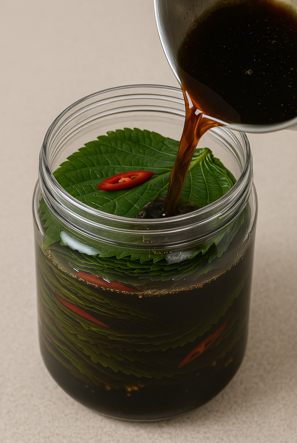 4. 담기: 깻잎을 통에 차곡차곡 넣고, 고추를 중간중간 끼워 넣은 후 식힌 간장물을 붓습니다.