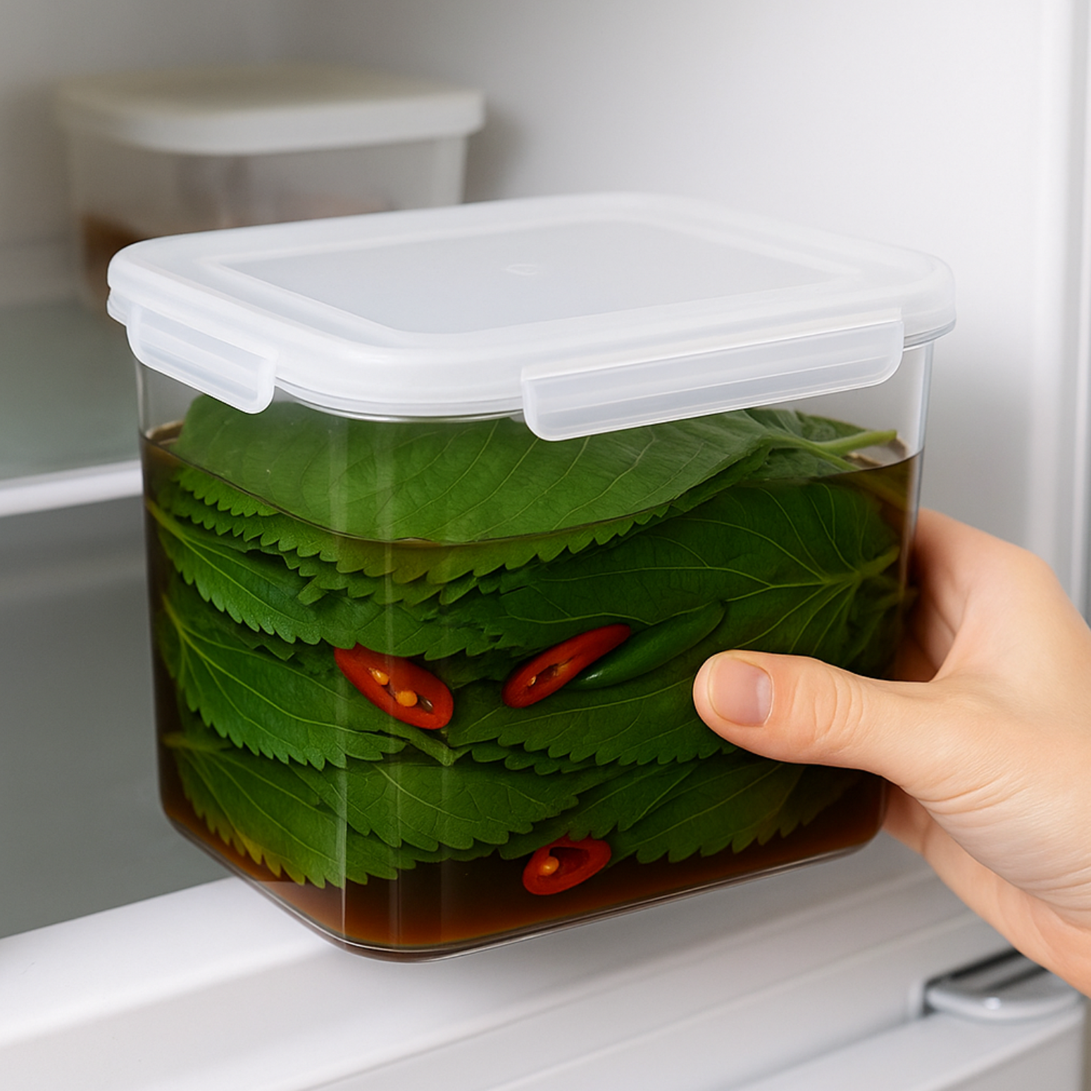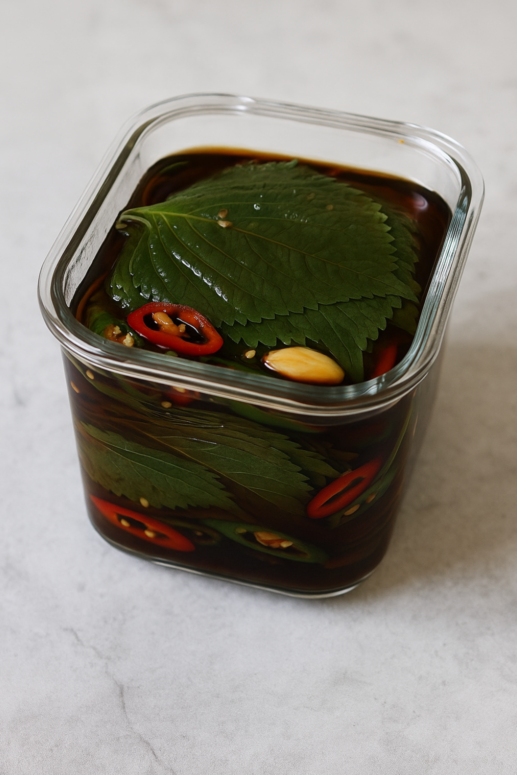 4. 담기: 깻잎을 통에 차곡차곡 넣고, 고추를 중간중간 끼워 넣은 후 식힌 간장물을 붓습니다.