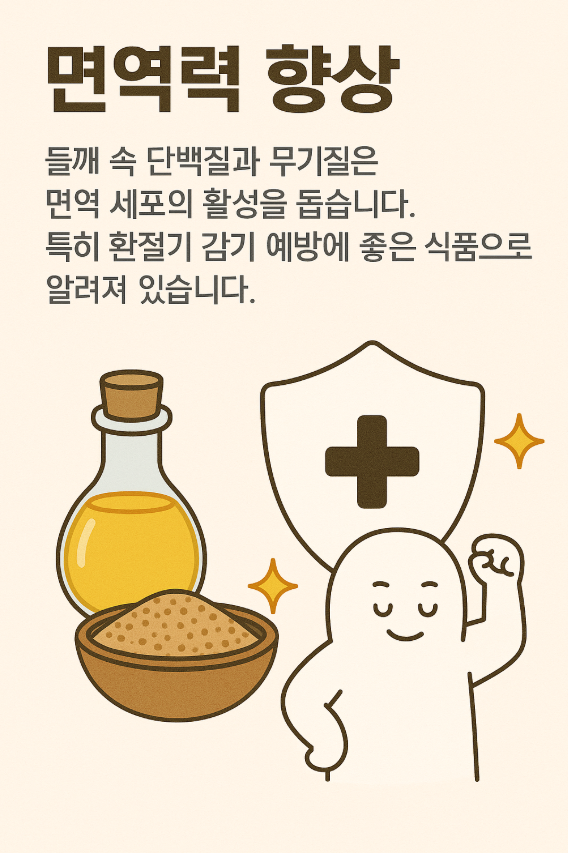 들깨유에는 비타민 E와 불포화지방산이 풍부해 피부 재생을 돕고, 건조함을 완화합니다. - 면역력 향상
