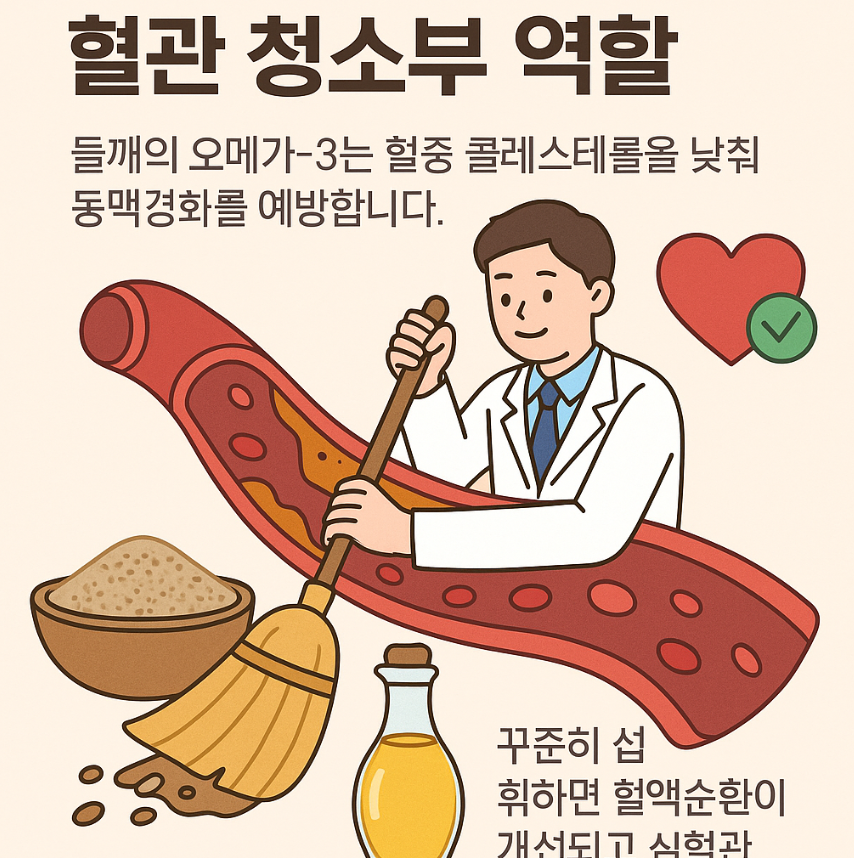들깨의 오메가-3는 혈중 콜레스테롤을 낮춰 동맥경화를 예방합니다.