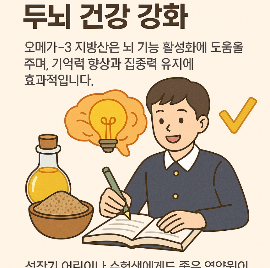 오메가-3 지방산은 뇌 기능 활성화에 도움을 주며, 기억력 향상과 집중력 유지에 효과적입니다.