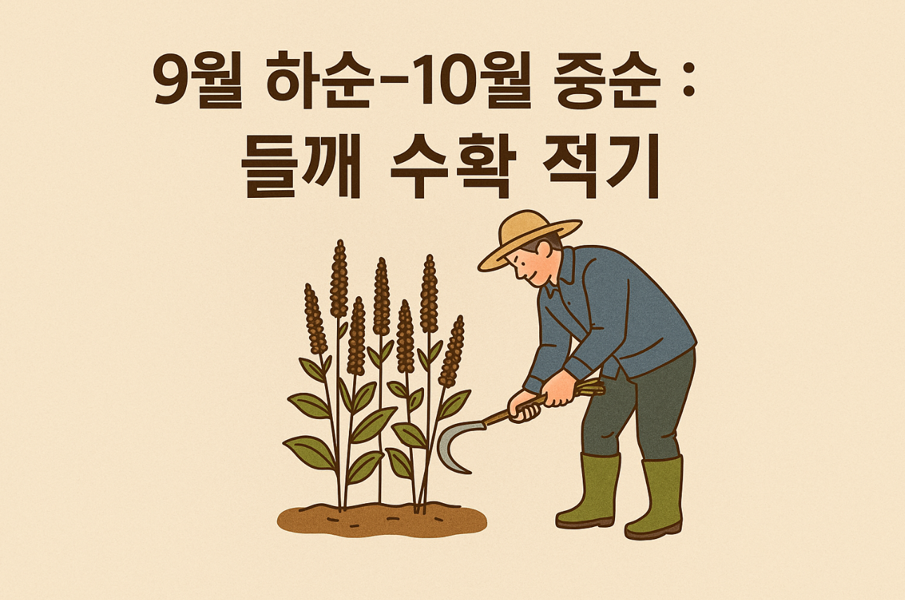 들깨의 수확시기는 9월 말에서 10월 중순 사이가 가장 알맞습니다.