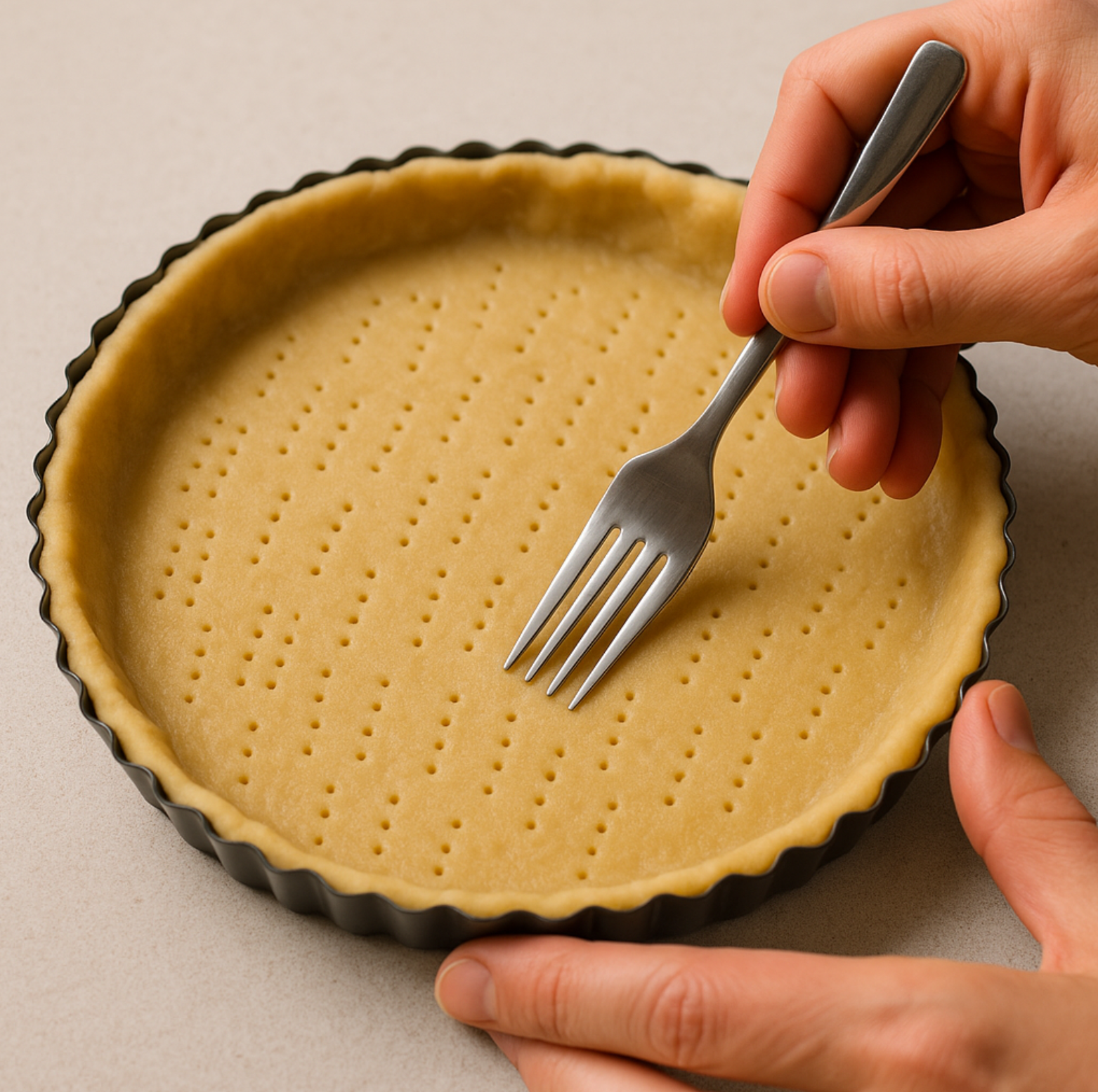 - 파이 준비 – 파이 틀에 크러스트를 깔고 포크로 구멍을 내줍니다.