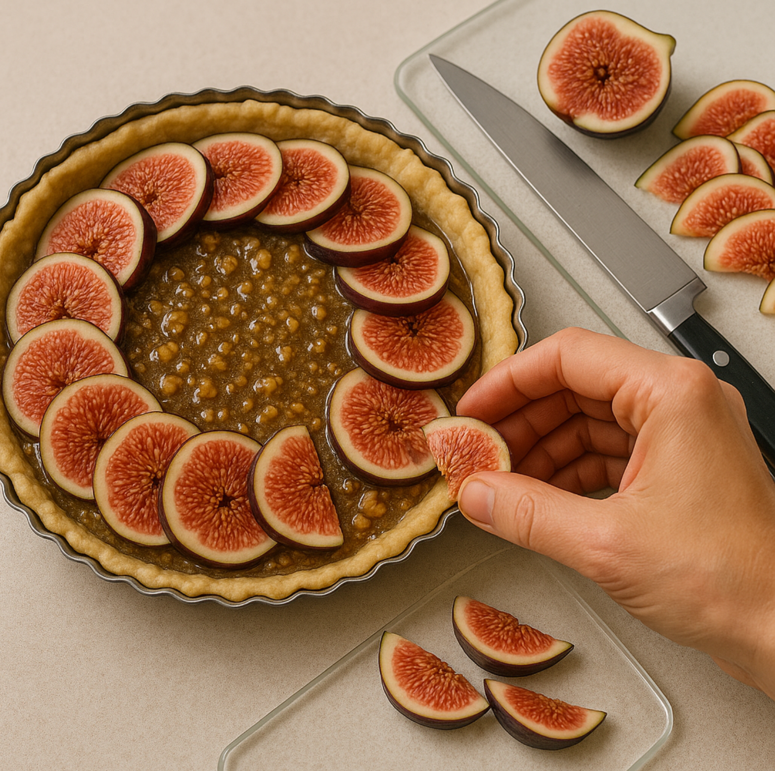 - 무화과 토핑 – 무화과를 세로로 얇게 썰어 위에 보기 좋게 올립니다.