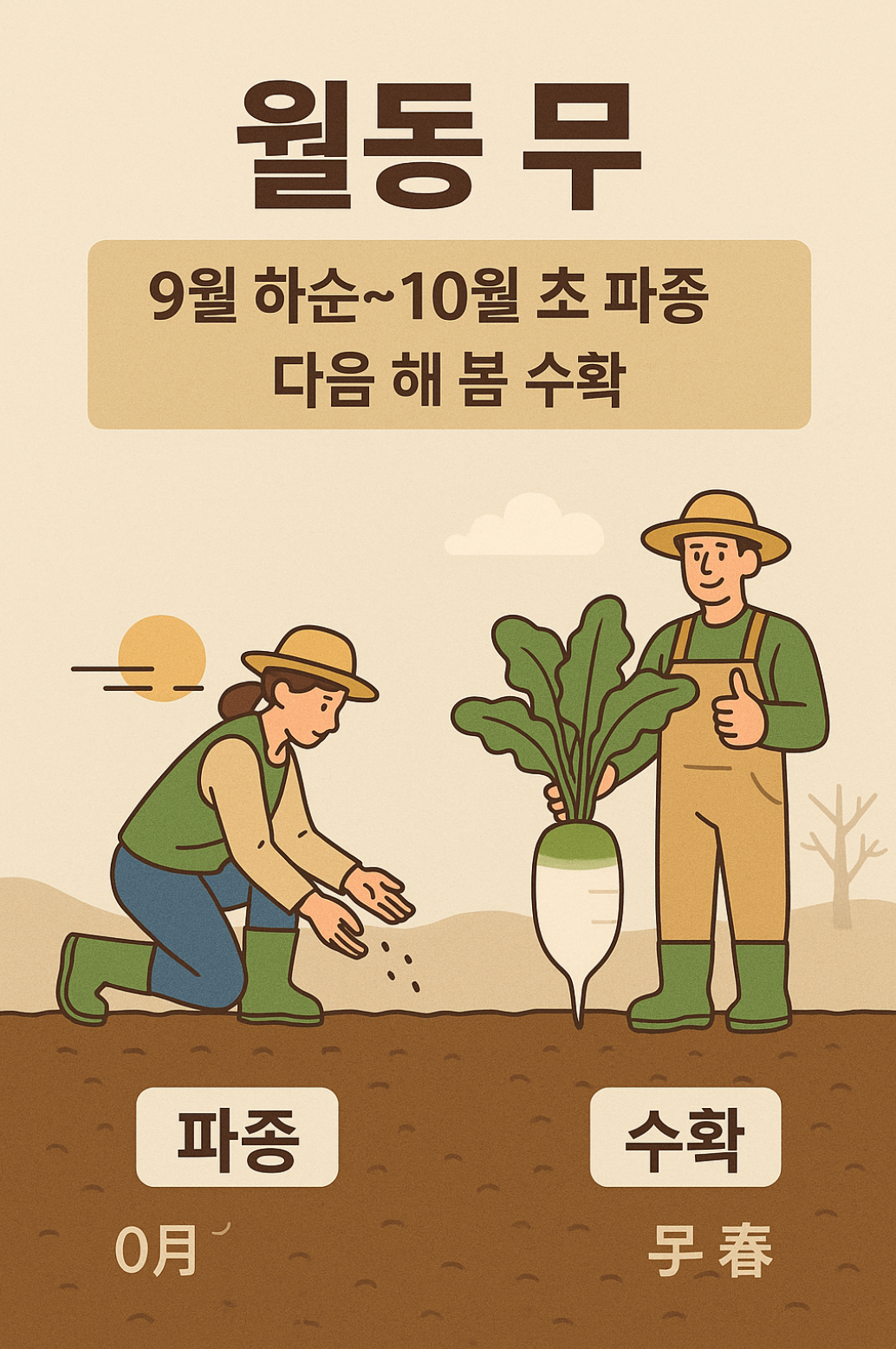 • 월동 무 : 9월 하순~10월 초 파종, 다음 해 봄 수확