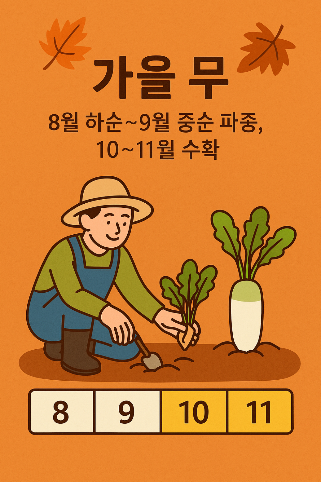 • 가을 무 : 8월 하순 ~ 9월 중순 파종, 10~11월 수확