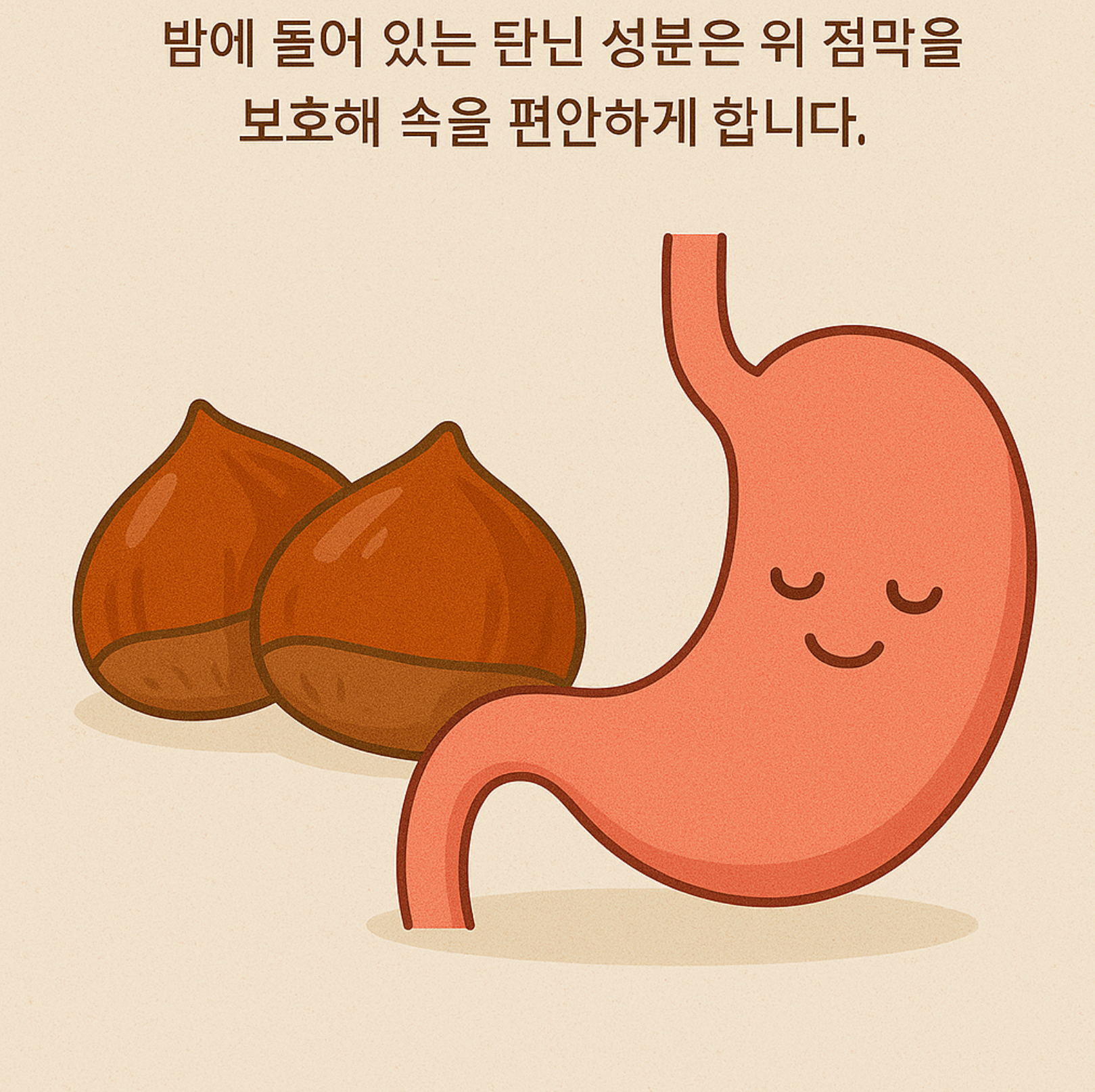 - 위 건강 개선 : 밤에 들어 있는 탄닌 성분은 위 점막을 보호해 속을 편안하게 합니다.