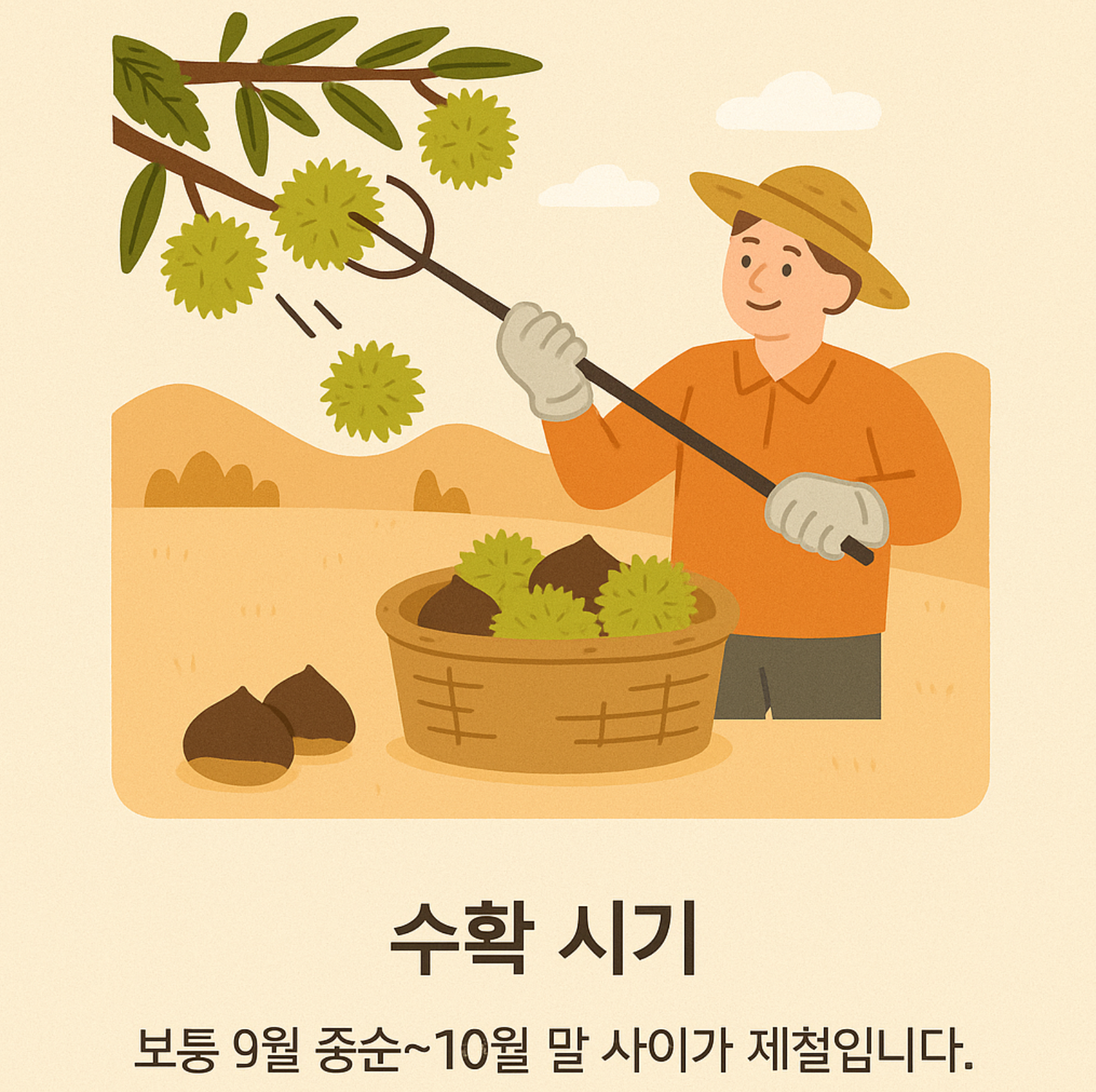 - 특징 : 초가을 밤은 수분이 많아 부드럽고, 늦가을 밤은 단맛이 진해집니다.