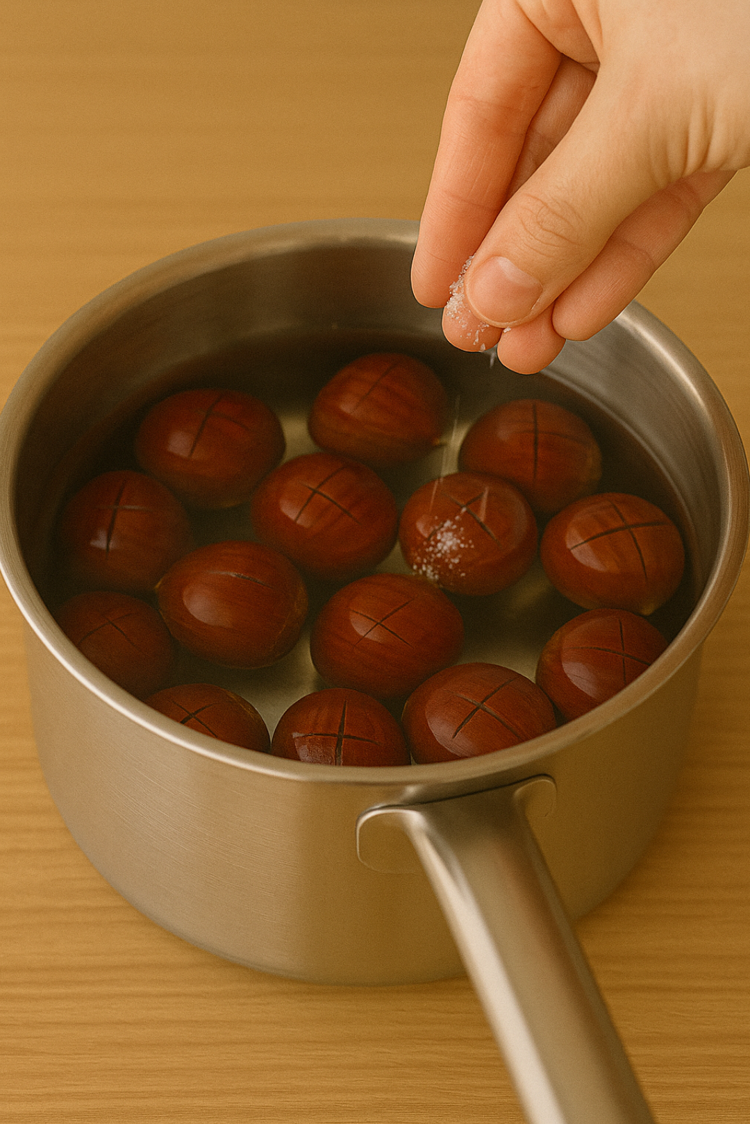 - 냄비에 밤이 잠길 정도의 물을 붓고, 소금을 한 작은술 넣습니다.
