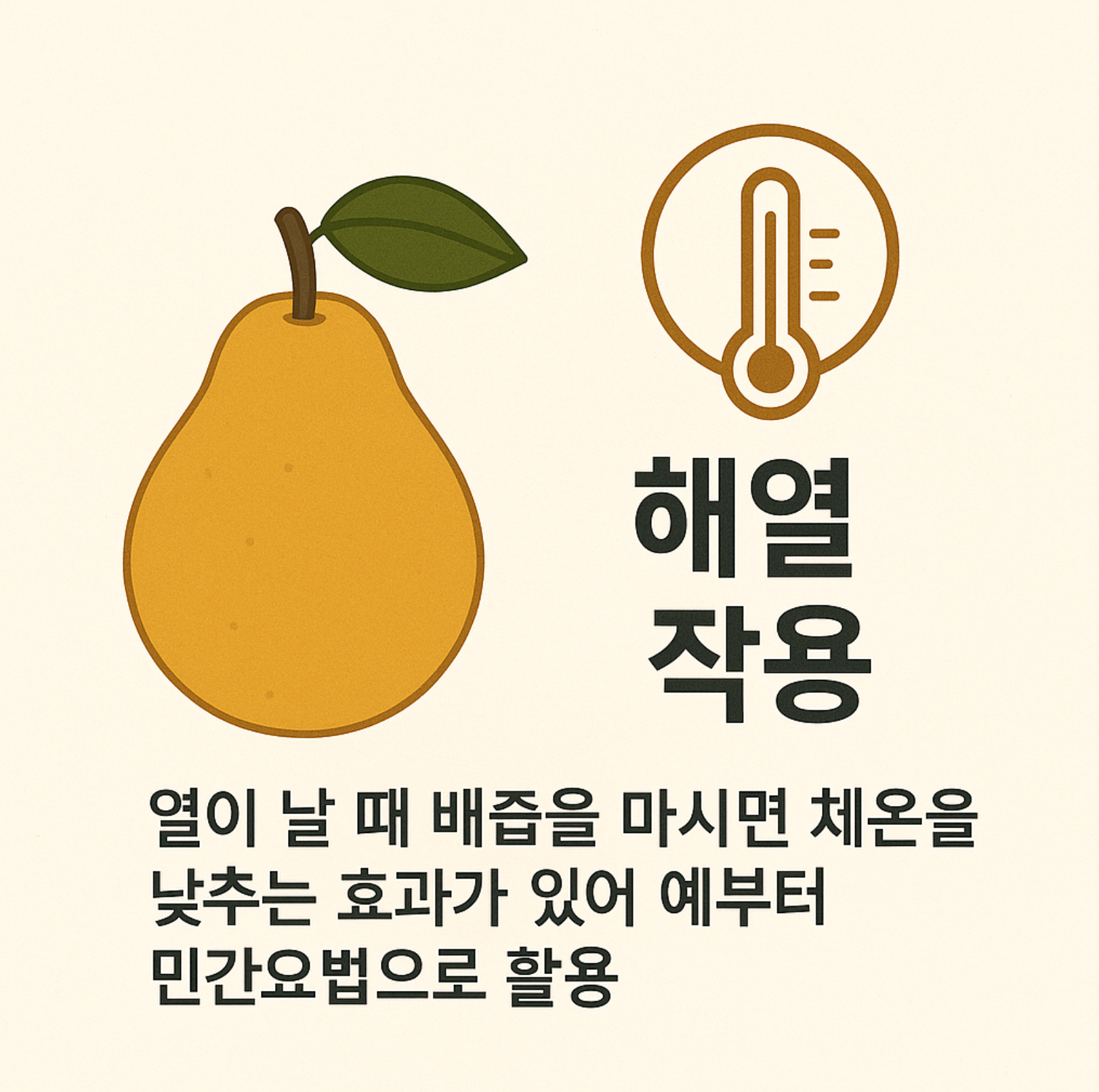 열이 날 때 배즙을 마시면 체온을 낮추는 효과가 있어 예부터 민간요법으로 활용되었습니다.