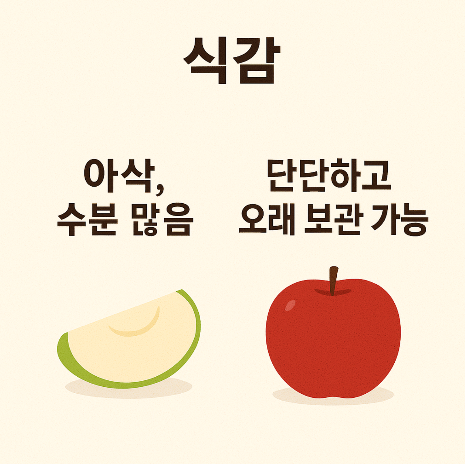 | 식감 | 아삭, 수분 많음 | 단단하고 오래 보관 가능 |