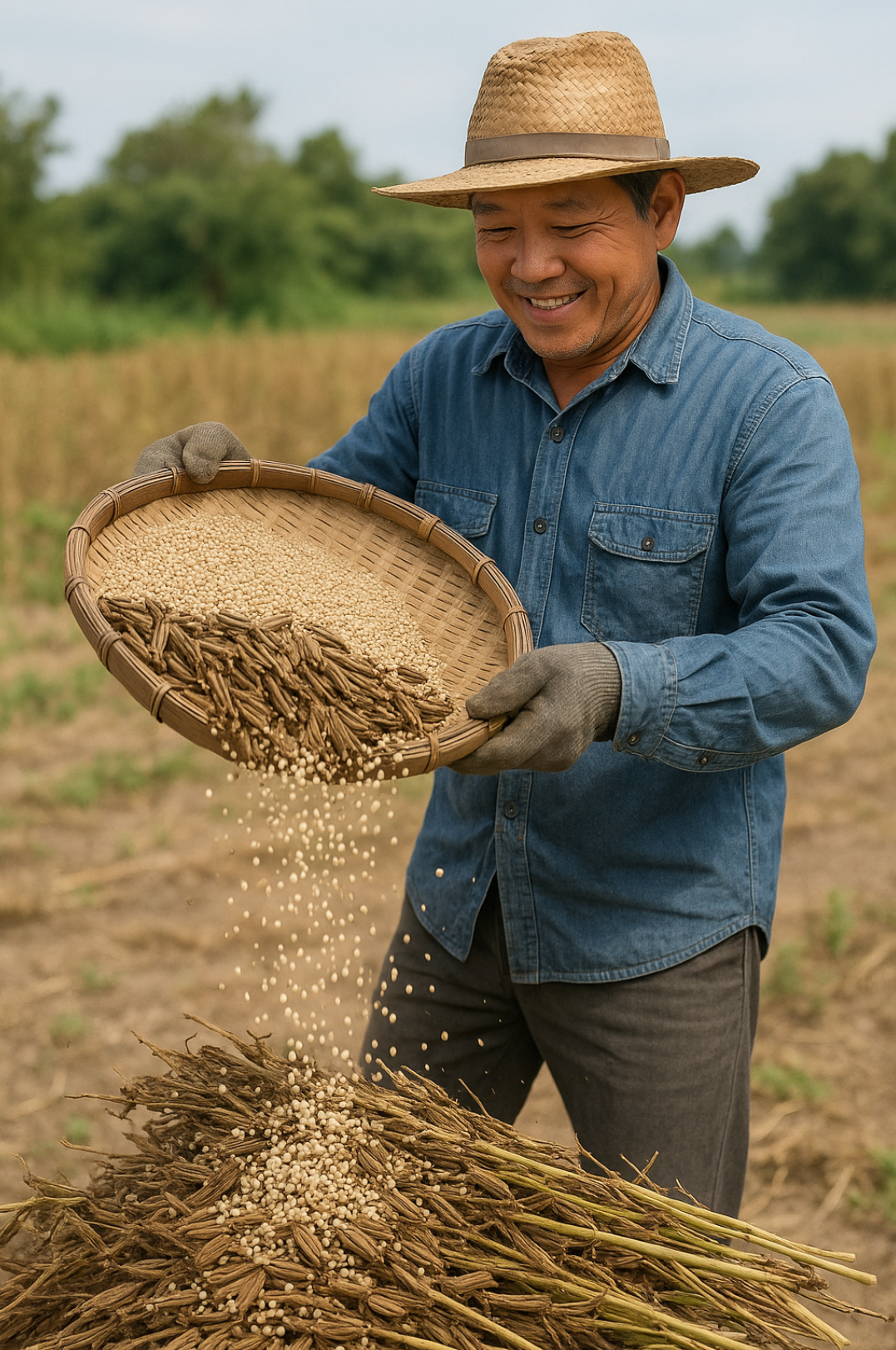 전통 방식은 농부들이 직접 손으로 줄기를 털었지만, 최근에는 기계화로 효율적으로 수확하기도 합니다.