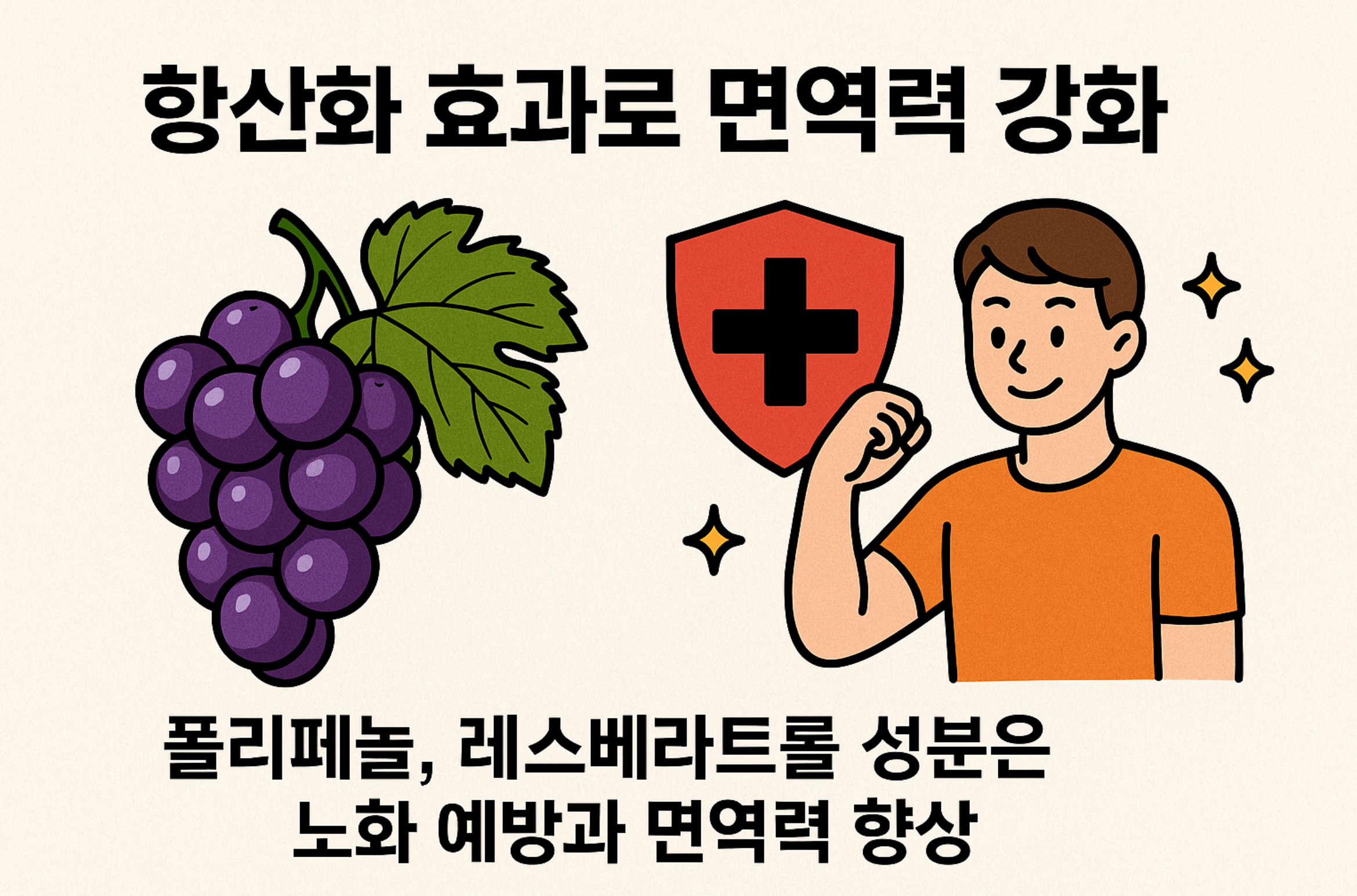 포도 껍질과 씨에 들어 있는 폴리페놀, 레스베라트롤 성분은 노화 예방과 면역력 향상에 효과적입니다.