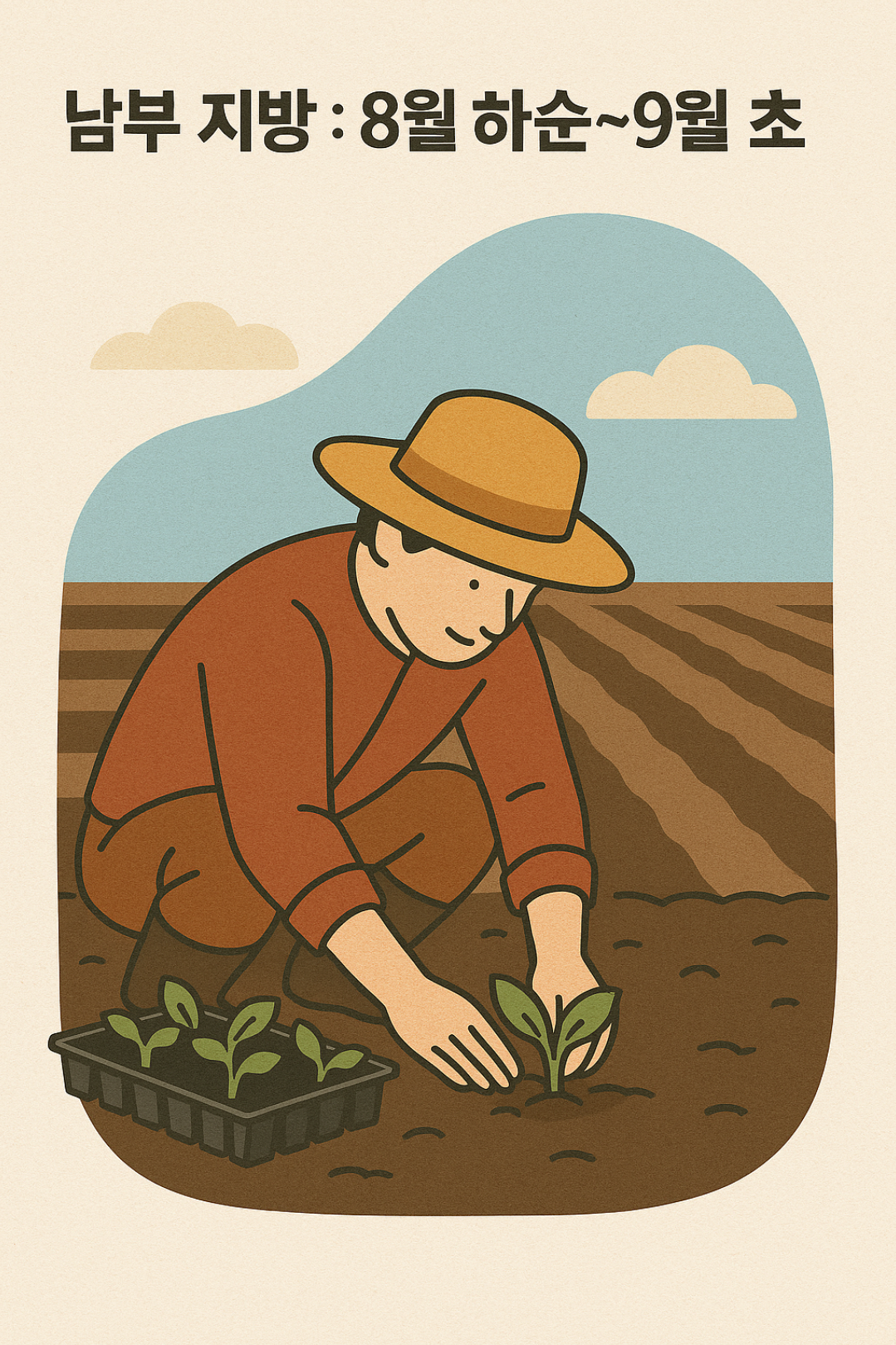 📌 포인트 : 기온이 너무 높으면 배추가 웃자라고, 너무 늦으면 김장 시기까지 알이 차지 못합니다. 지역별 기후를 고려해 첫 서리 오기 약 70일 전을 기준으로 잡으면 가장 좋습니다.