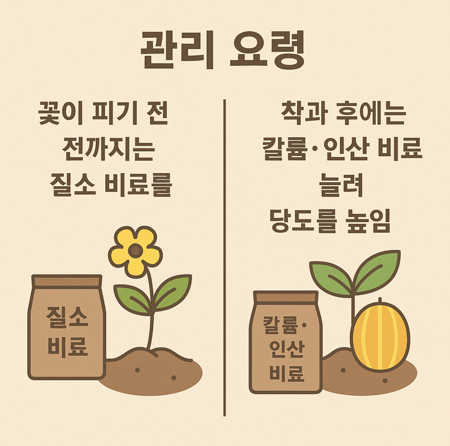 - 관리 요령: 꽃이 피기 전까지는 질소 비료를, 착과 후에는 칼륨·인산 비료를 늘려 당도를 높임