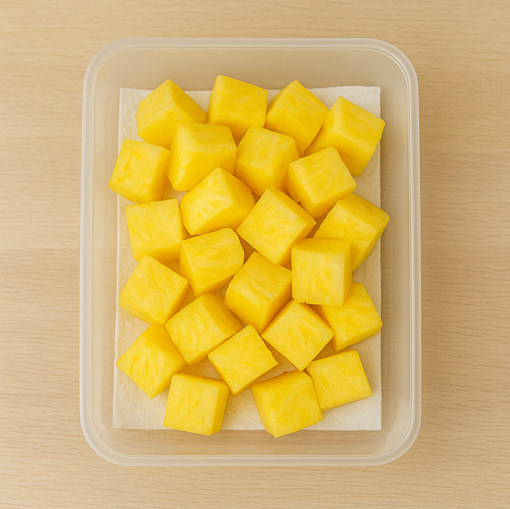 껍질을 제거하고 잘라놓은 파인애플은 밀폐 용기에 넣어 냉장 보관하면 2~3일은 괜찮습니다. 단, 물기가 많아지면 맛이 떨어지니 키친타월로 물기를 살짝 제거한 뒤 넣는 걸 추천해요.